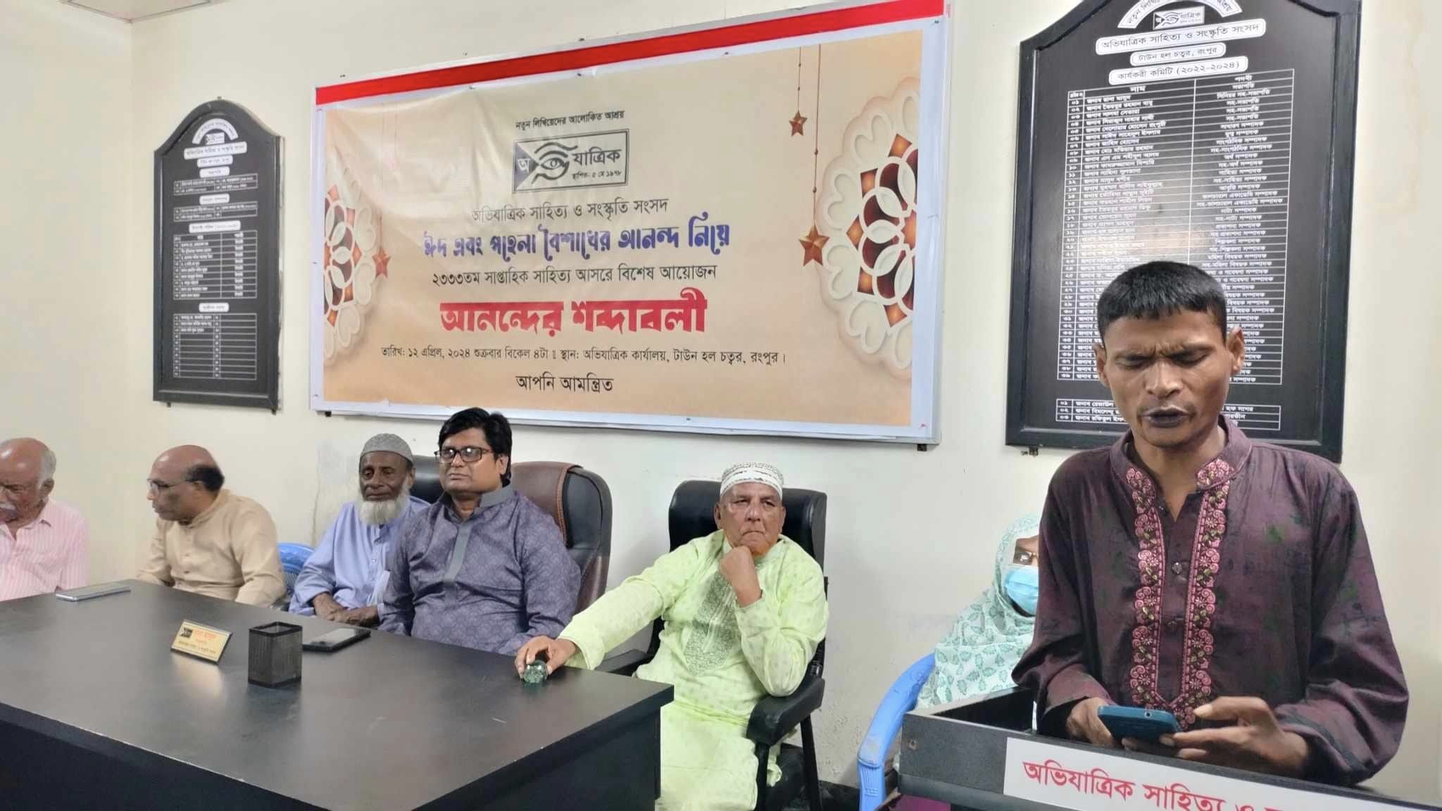 ১২ এপ্রিল /২০২৪ শুক্রবার বিকেল চারটায় অভিযাত্রিক সাহিত্য ও সংস্কৃতি সংসদ, টাউন হল চত্বর, রংপুরে ২৩৩৩ তম সাপ্তাহিক সাহিত্য আসর ও ঈদ পূর্ণমিলনী অনুষ্ঠান “আনন্দের শব্দাবলী” শীর্ষক অনুষ্ঠান অভিযাত্রিক সভাপতি রানা মাসুদ- এর সভাপতিত্বে অনুষ্ঠিত হয়।