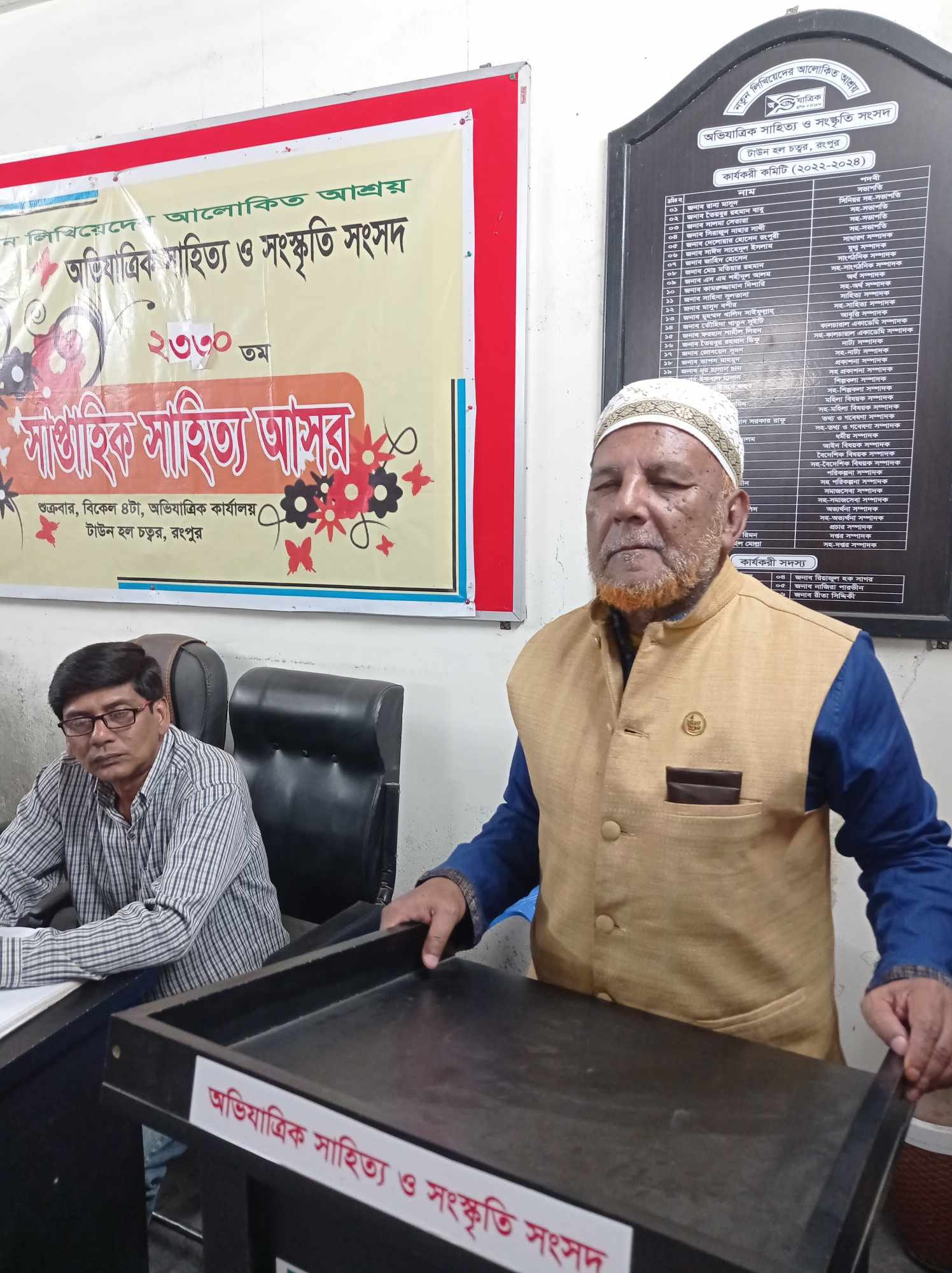 সদ্য প্রয়াত অভিযাত্রিক জনাব মাহমুদ ইলাহী মন্ডলের রূহের মাগফিরাত কামনা করে অভিযাত্রিকের সাপ্তাহিক সাহিত্য আসর অনুষ্ঠিত, অভিযাত্রিক সাহিত্য ও সংস্কৃতি সংসদ, রংপুর এর ২৩৩০ তম সাপ্তাহিক সাহিত্য আসর আজ অভিযাত্রিকের নিজস্ব কার্যালয়ে অনুষ্ঠিত হয়। আজকের আসরের সভাপতিত্ব করেন অভিযাত্রিকের সিনিয়র সহ-সভাপতি তৈয়বুর রহমান বাবু। সাহিত্য সম্পাদক মাসুদ বশীর এর প্রাণবন্ত উপস্থাপনায় আজকের আসরে কবিতা পাঠ করেন- তৈয়বুর রহমান বাবু, মতিয়ার রহমান, মাসুম মোরশেদ, রিয়াজুল হক সাগর,মতিয়ার রহমান,দিনাজপুর থেকে আগত কবি আব্দুল গাফ্ফার চৌধুরী, আখতারুজ্জামান সবুজ, মো. রাজু ইসলাম, মাসুদ বশীর প্রমূখ। আজকের আসরে কবিতা আবৃত্তি ও ইসলামি সঙ্গীত পরিবেশন করেন শাহিল ফারহান লিয়ন। আসরে পঠিত লেখাগুলো নিয়ে তাৎক্ষণিক আলোচনা করেন মাসুদ বশীর। সদ্য প্রয়াত অভিযাত্রিক জনাব মাহমুদ ইলাহী মন্ডলের রূহের মাগফিরাত কামনা করে আসরে দোয়া করা হয়।পরিশেষে সভাপতি তাঁর সমাপনী বক্তব্যের মাধ্যমে আজকের আসরের সমাপ্তি ঘোষণা করেন।