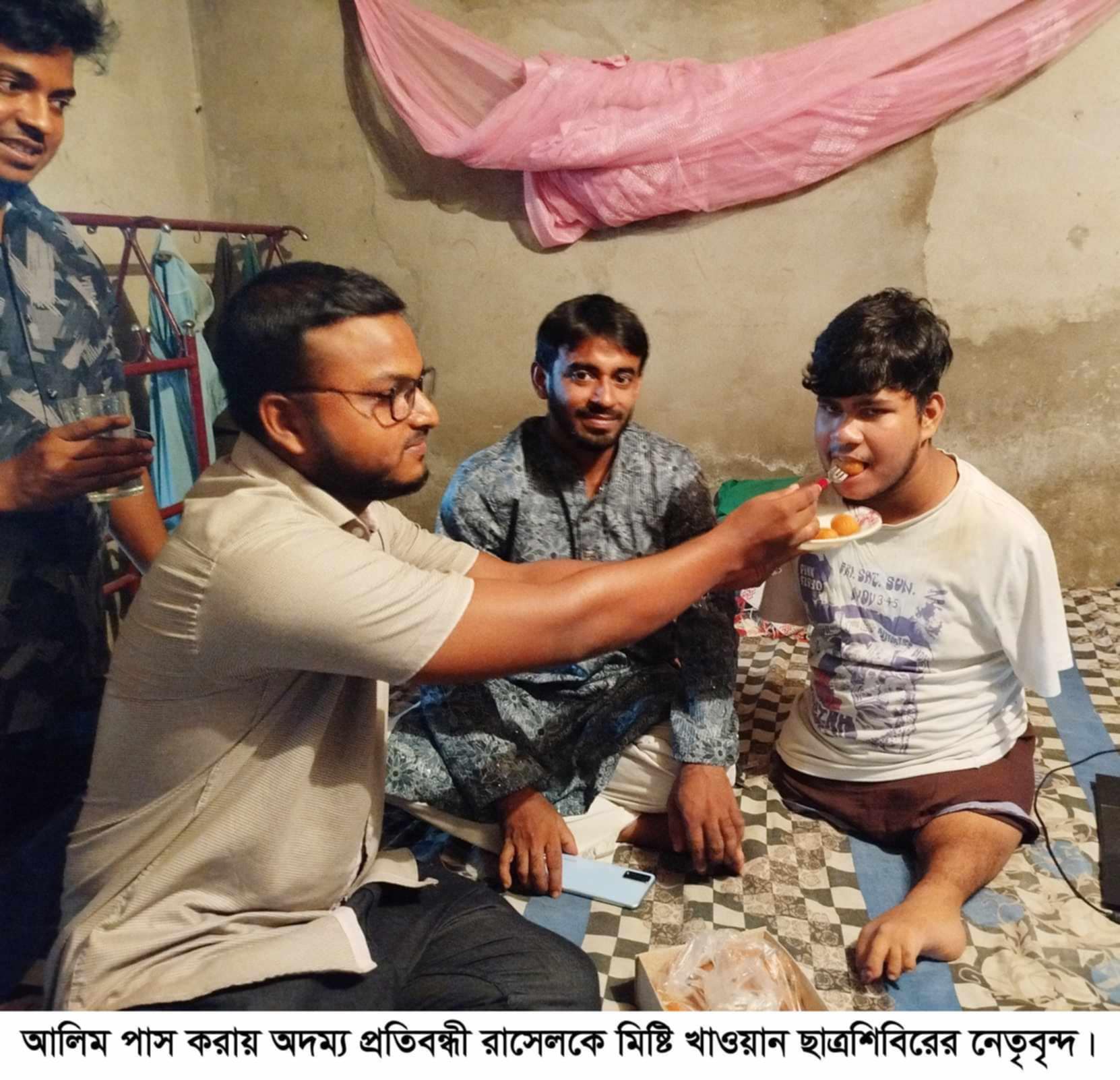 আলিম পরিক্ষায় পাস করা অদম্য প্রতিবন্ধী রাসেল মৃধার লেখাপড়ার দায়িত্ব নিয়েছেন ইসলামী ছাত্রশিবির। বুধবার দুপুরে তাকে শুভেচ্ছা প্রদান ও মিষ্টিমুখ করাতে তার বাসায় উপস্থিত হয়ে লেখাপড়ার দায়িত্ব নেওয়ার কথা বলেন ছাত্রশিবিরের নেতৃবৃন্দ।