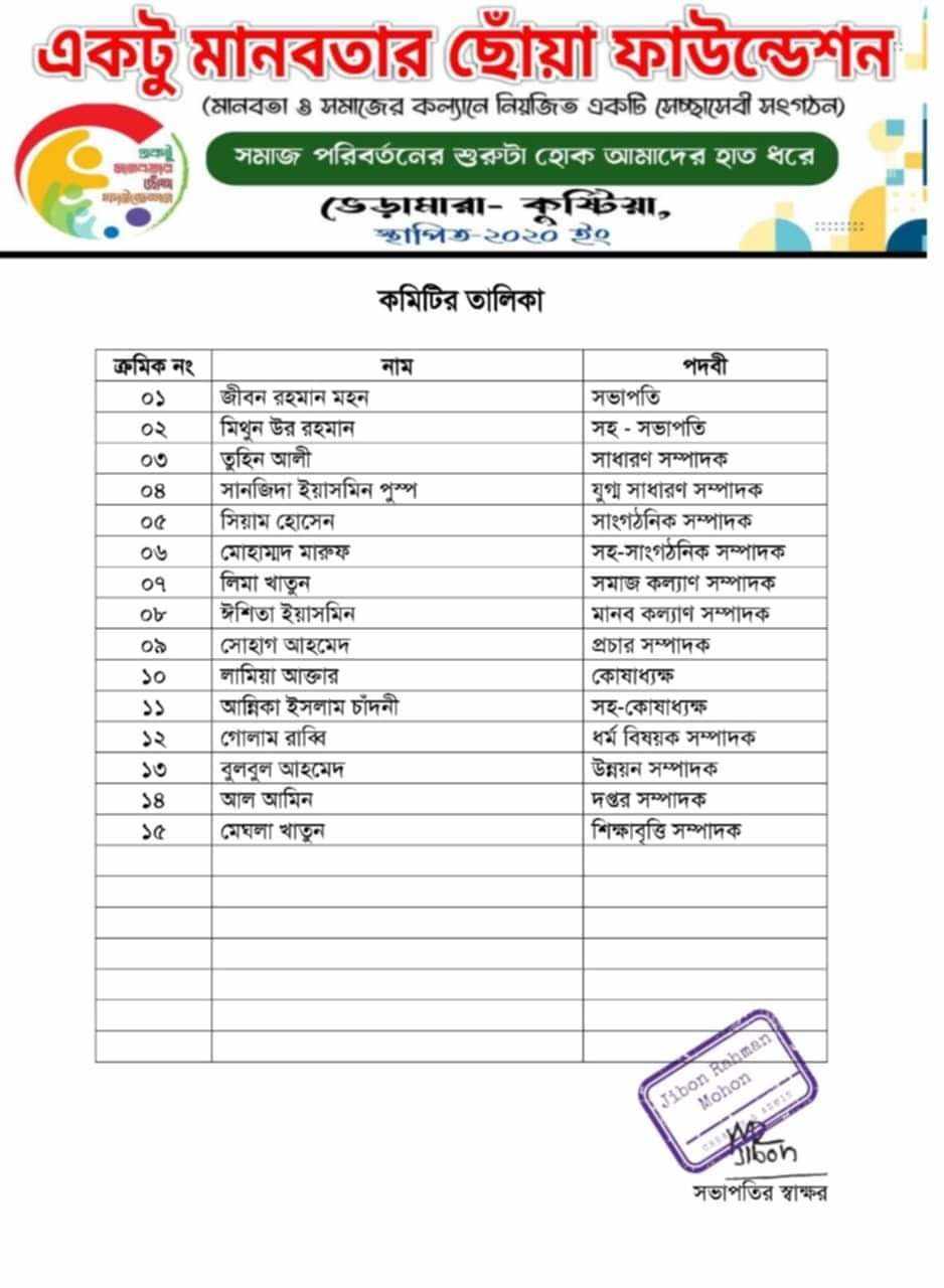 ভেড়ামারা একটু মানবতার ছোঁয়া ফাউন্ডেশন-এর কার্যালয়ে এই কমিটি উন্মোচন অনুষ্ঠান অনুষ্ঠিত হয়।