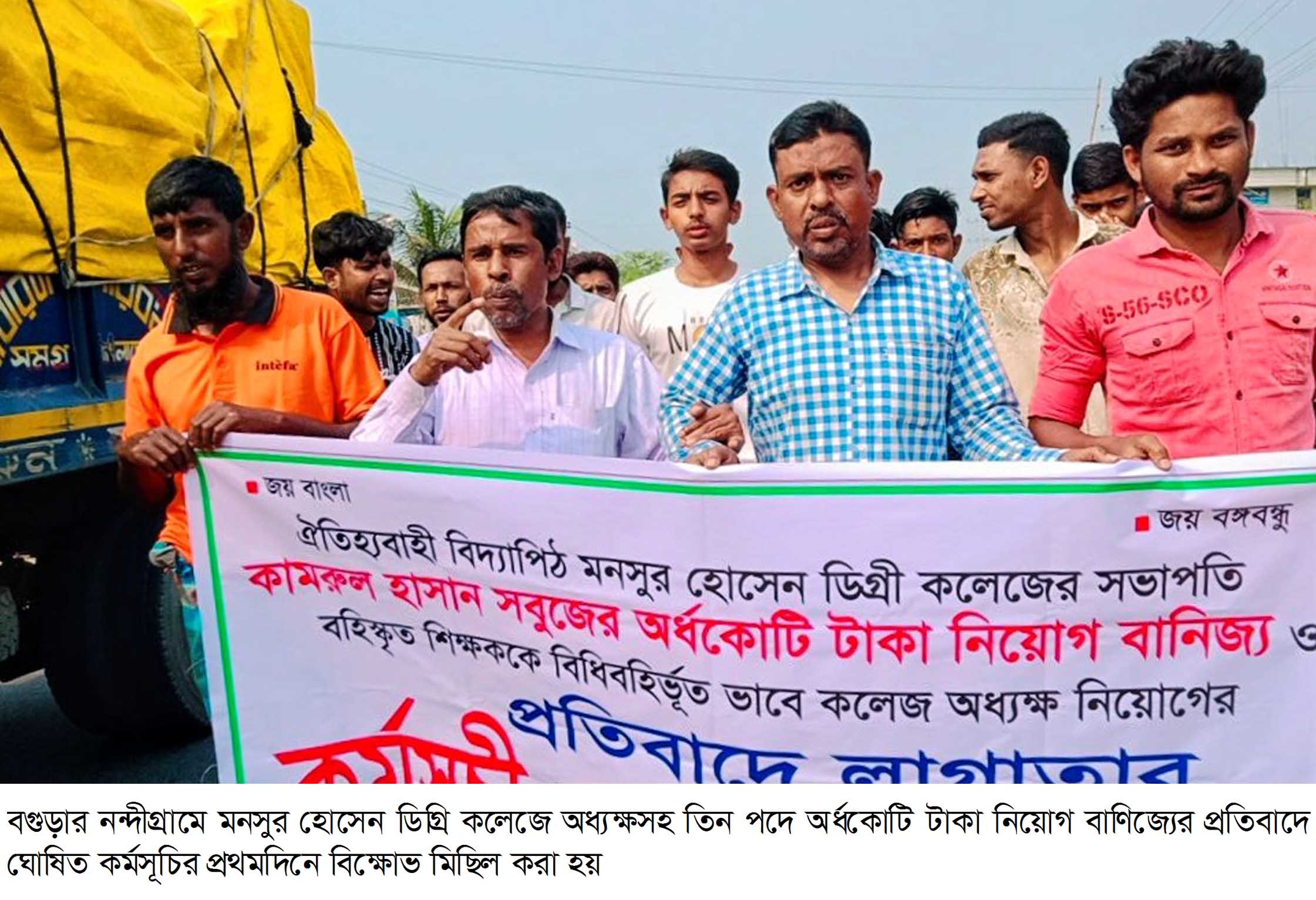নন্দীগ্রাম (বগুড়া) প্রতিনিধি : বগুড়ার নন্দীগ্রামে মনসুর হোসেন ডিগ্রি কলেজে অধ্যক্ষসহ তিন পদে অর্ধকোটি টাকা নিয়োগ বাণিজ্যের প্রতিবাদে ঘোষিত কর্মসূচির প্রথমদিনে বিক্ষোভ মিছিল করা হয়েছে।