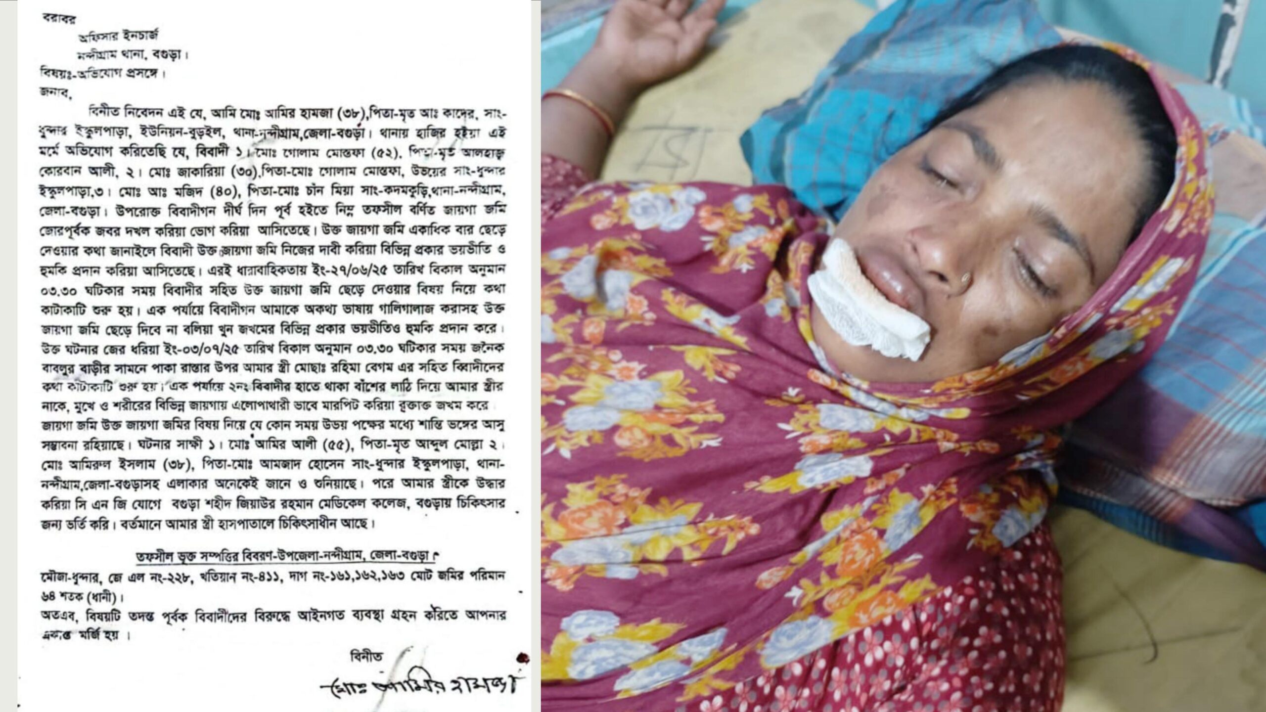 বগুড়ার নন্দীগ্রামে জায়গা জমির বিরোধের জেরে প্রতিপক্ষের হামলায় রহিমা বেগম (৩৫) নামে একজন নারীকে গুরুতর আহত করার অভিযোগ উঠেছে। ঘটনাটি ঘটেছে গত বৃহস্পতিবার (৩ জুলাই) বিকেল সাড়ে ৩টার দিকে নন্দীগ্রাম উপজেলার বুড়ইল ইউনিয়নের ধুন্দার হাইস্কুল পাড়া এলাকায়।এঘটনায় আহত রহিমা বেগমের স্বামী আমির হামজা রাতে বাদি হয়ে নন্দীগ্রাম থানায় একটি লিখিত অভিযোগ দায়ের করেন।অভিযোগ সূত্রে জানা যায়, নন্দীগ্রাম উপজেলার ধুন্দার মৌজার জেএল নং-২২৮, খতিয়ান নং-৪১১, দাগ নং-১৬১,১৬২,১৬৩ মোট ৬৪ শতক (ধানী) জমি একই এলাকার মৃত আলহাজ্ব কোরবান আলীর ছেলে গোলাম মোস্তফা (৫২), গোলাম মোস্তফার ছেলে মো: জাকারিয়া (৩০), কদমকুড়ি গ্রামের চাঁন মিয়ার ছেলে আঃ মজিদ (৪০) বিবাদীগন দীর্ঘ দিন পূর্ব হইতে উপরোক্ত তফসীল বর্ণিত জায়গা জমি জোরপূর্বক জবর দখল করিয়া ভোগ করিয়া আসিতেছে। উক্ত জায়গা জমি একাধিক বার ছেড়ে দেওয়ার কথা জানাইলে বিবাদী উক্ত জায়গা জমি নিজের দাবী করিয়া বিভিন্ন প্রকার ভয়ভীতি ও হুমকি প্রদান করিয়া আসিতেছে। এরই ধারাবাহিকতায় ইং-২৭/০৬/২৫ তারিখ বিকাল অনুমান ০৩.৩০ ঘটিকার সময় বিবাদীর সহিত উক্ত জায়গা জমি ছেড়ে দেওয়ার বিষয় নিয়ে কথা কাটাকাটি শুরু হয়। এক পর্যায়ে বিবাদীগন আমাকে অকথ্য ভাষায় গালিগালাজ করাসহ উক্ত জায়গা জমি ছেড়ে দিবে না বলিয়া খুন জখমের বিভিন্ন প্রকার ভয়ভীতিও হুমকি প্রদান করে। উক্ত ঘটনার জের ধরিয়া ইং-০৩/০৭/২৫ তারিখ বিকাল অনুমান ০৩.৩০ ঘটিকার সময় জনৈক বাবলুর বাড়ীর সামনে পাকা রাস্তার উপর আমার স্ত্রী মোছাঃ রহিমা বেগম এর সহিত ব্বিাদীদের কথা কাটাকাটি শুরু হয়। এক পর্যায়ে ২নং বিবাদীর হাতে থাকা বাঁশের লাঠি দিয়ে আমার স্ত্রীর নাকে, মুখে ও শরীরের বিভিন্ন জায়গায় এলোপাথারী ভাবে মারপিট করে বৃক্তাক্ত জখম করে।গুরুতর আহত অবস্থায় রহিমা বেগমকে উদ্ধার করে বগুড়া শহীদ জিয়াউর রহমান মেডিকেল কলেজ হাসপাতালে চিকিৎসার জন্য ভর্তি করা হয়েছে।এ বিষয়ে অভিযুক্ত গোলাম মোস্তফার সঙ্গে যোগাযোগ করা হলে তাকে পাওয়া যায়নি।জানতে চাইলে নন্দীগ্রাম থানার অফিসার ইনচার্জ (ওসি) মোজাহারুল ইসলাম বলেন, আমরা একটি অভিযোগ পেয়েছি। তদন্ত সাপেক্ষে আইনানুগ ব্যবস্থা গ্রহণ করা হবে।