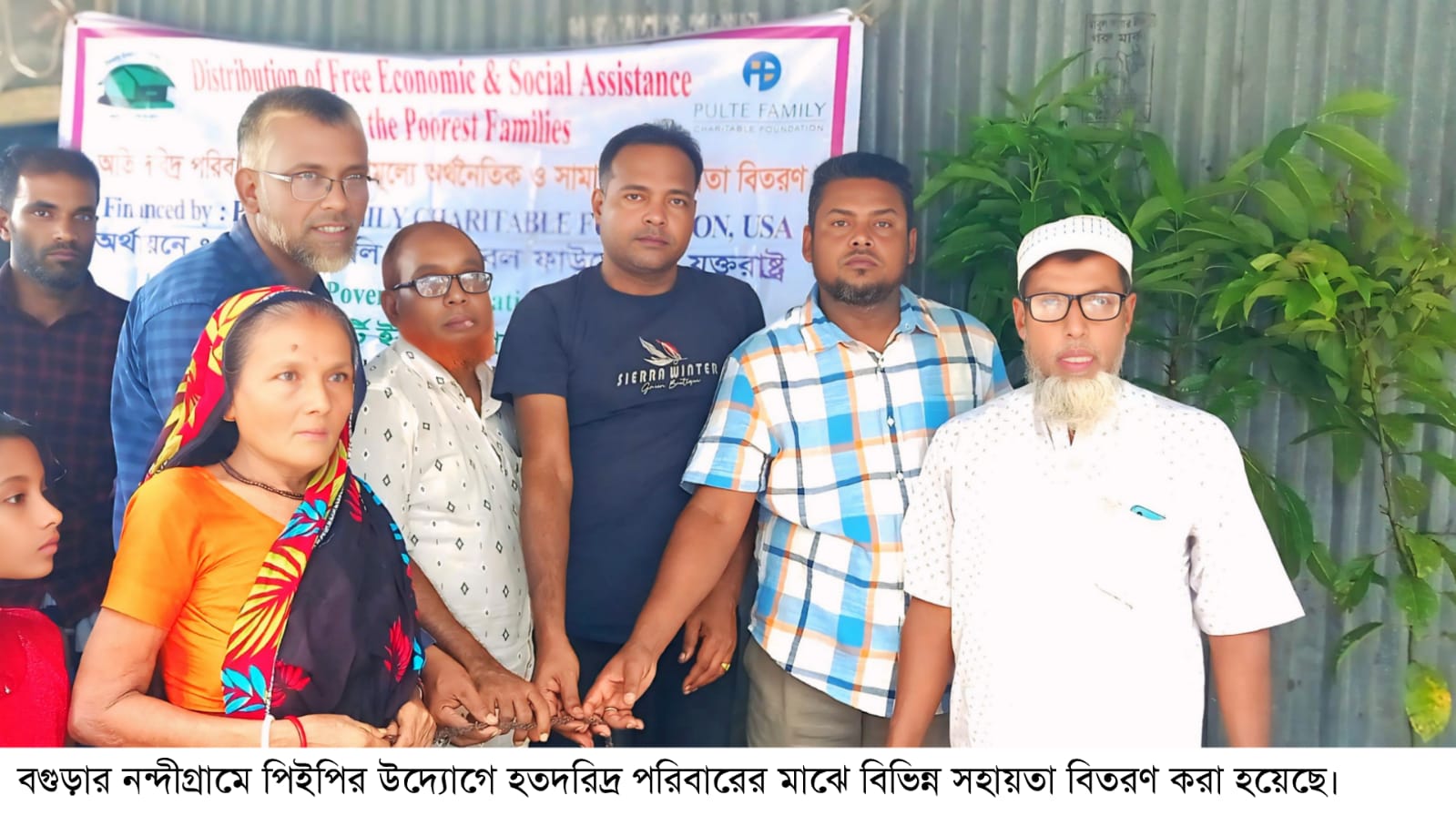 বগুড়ার নন্দীগ্রামে পিইপির উদ্যোগে হতদরিদ্র পরিবারের মাঝে বিভিন্ন সহায়তা বিতরণ করা হয়েছে। রবিবার (৩ আগস্ট) দুপুরে নন্দীগ্রাম পৌরসভার ৩নং ওয়ার্ডের বেলঘড়িয়াস্থ পিইপির সাব-সেন্টার কার্যালয়ে এ সহায়তা বিতরণ করা হয়। সহায়তা বিতরণী অনুষ্ঠানে আদিবাসী সহ ৪টি হতদরিদ্র পরিবারের মাঝে ৪টি ছাগল, ১পরিবারের মাঝে কুঠির শিল্পের জন্য নগদ অর্থ, ৪ পরিবারের মাঝে খাদ্য, ৩ পরিবারকে ঘর মেরামতের জন্য ঢেউটিন, ২ জনকে চিকিৎসা ও ৩ শিক্ষার্থীকে শিক্ষা সহায়তা এবং ৪০ পরিবারের মাঝে গাছের চারা বিতরণ করা হয়। অনুষ্ঠানে পিইপির বগুড়া জেলা মাঠ সমন্বয়কারী আব্দুল খালেকের সভাপতিত্বে ও ইউনিয়ন সমন্বয়কারী উজ্জল হোসেনের সঞ্চালনায় সহায়তা বিতরণী অনুষ্ঠানে বক্তব্য রাখেন, নন্দীগ্রাম উপজেলা প্রেস ক্লাবের সভাপতি ফজলুর রহমান, নন্দীগ্রাম প্রেস ক্লাবের সভাপতি নাজমুল হুদা, সাংবাদিক মামুন আহমেদ, নন্দীগ্রাম সদর ইউনিয়ন পরিষদের ৭নং ইউপি সদস্য আলামিন, সমাজসেবক রফিকুল ইসলাম প্রমুখ। পিইপি এটি এমন একটি ব্যতিক্রমধর্মী এনজিও প্রতিষ্ঠান। যে এনজিও কোনো প্রকার সঞ্চয় বা অর্থ না নিয়েই হতদরিদ্র পরিবারের মাঝে বিভিন্ন সহায়তা বিতরণ করে আসছে। যা এলাকাবাসী প্রশংসনীয় উদ্যোগ হিসেবে গণ্য করেন।