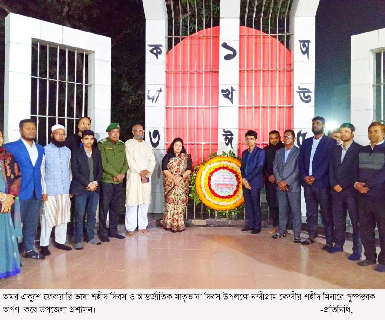 বগুড়ার নন্দীগ্রামে নানা আয়োজনে ২১ ফেব্রুয়ারি শহীদ দিবস ও আন্তর্জাতিক মাতৃভাষা দিবস পালিত হয়েছে। দিবসটি উপলক্ষ্যে রাত ১২টা ১মিনিটে নন্দীগ্রাম উপজেলা কেন্দ্রীয় শহীদ মিনারে উপজেলা উপজেলা প্রশাসন, নন্দীগ্রাম পৌরসভা, মুক্তিযোদ্ধা সংসদ, থানা প্রশাসন, প্রেসক্লাবসহ বিভিন্ন সংগঠন ও প্রতিষ্ঠানের পক্ষ থেকে পুষ্পস্তবক অর্পণ করা হয়। ২১ ফেব্রুয়ারি সকালে সূর্যোদয়ের সাথে সাথে সরকারি, আধাসরকারি, বেসরকারি অফিস এবং সকল স্কুল, কলেজ ও মাদ্রাসাসহ অন্যান্য প্রতিষ্ঠানের ভবন সমূহে জাতীয় পতাকা অর্ধনমিতভাবে উত্তোলন করা হয়। এরপর সকাল ১০ টায় উপজেলা পরিষদ অডিটোরিয়ামে উপজেলা নির্বাহী অফিসার (ইউএনও) মোসা. লায়লা আঞ্জুমান বানু’র সভাপতিত্বে এবং উপজেলা কৃষি অফিসার গাজিউল হকের সঞ্চালনায় বক্তব্য রাখেন সহকারী কমিশনার (ভুমি) রোহান সরকার, উপজেলা প্রাণিসম্পদ অফিসার কল্পনা রানী রায়, নন্দীগ্রাম থানার ভারপ্রাপ্ত কর্মকর্তা (ওসি) তারিকুল ইসলাম, প্রাথমিক শিক্ষা অফিসার এস, এম সারোয়ার জাহান, উপজেলা সমাজসেবা অফিসার গোলাম মোস্তফা, নন্দীগ্রাম উপজেলা প্রেস ক্লাবের সভাপতি মো. ফজলুর রহমান, সাধারণ সম্পাদক আক্তার হোসেন দুলাল, দপ্তর সম্পাদক আব্দুল হাকিম, নন্দীগ্রাম মডেল প্রেসক্লাবের সাধারণ সম্পাদক প্রভাষক জাকারিয়া লিটন, যুগ্ম-সাধারণ সম্পাদক প্রভাষক আব্দুর রউফ উজ্জল প্রমুখ।পরে বিভিন্ন শিক্ষা প্রতিষ্ঠানের শিক্ষার্থীদের অংশগ্রহণে সাংস্কৃতিক অনুষ্ঠান অনুষ্ঠিত হয় এবং বিজয়ীদের মাঝে পুরস্কার বিতরণ করা হয়।