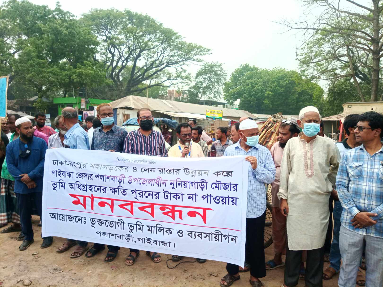 আশরাফুজ্জামান সরকার, গাইবান্ধা: ঢাকা-রংপুর মহাসড়ক চার লেনে উন্নীত করণের লক্ষ্যে গাইবান্ধার পলাশবাড়ী পৌর শহরের প্রাণকেন্দ্র নুনিয়াগাড়ি মৌজার অধিগ্রহণকৃত জমি-স্থাপনার টাকা দীর্ঘদিনেও না পেয়ে মানববন্ধন করেছে ক্ষতিগ্রস্তরা।