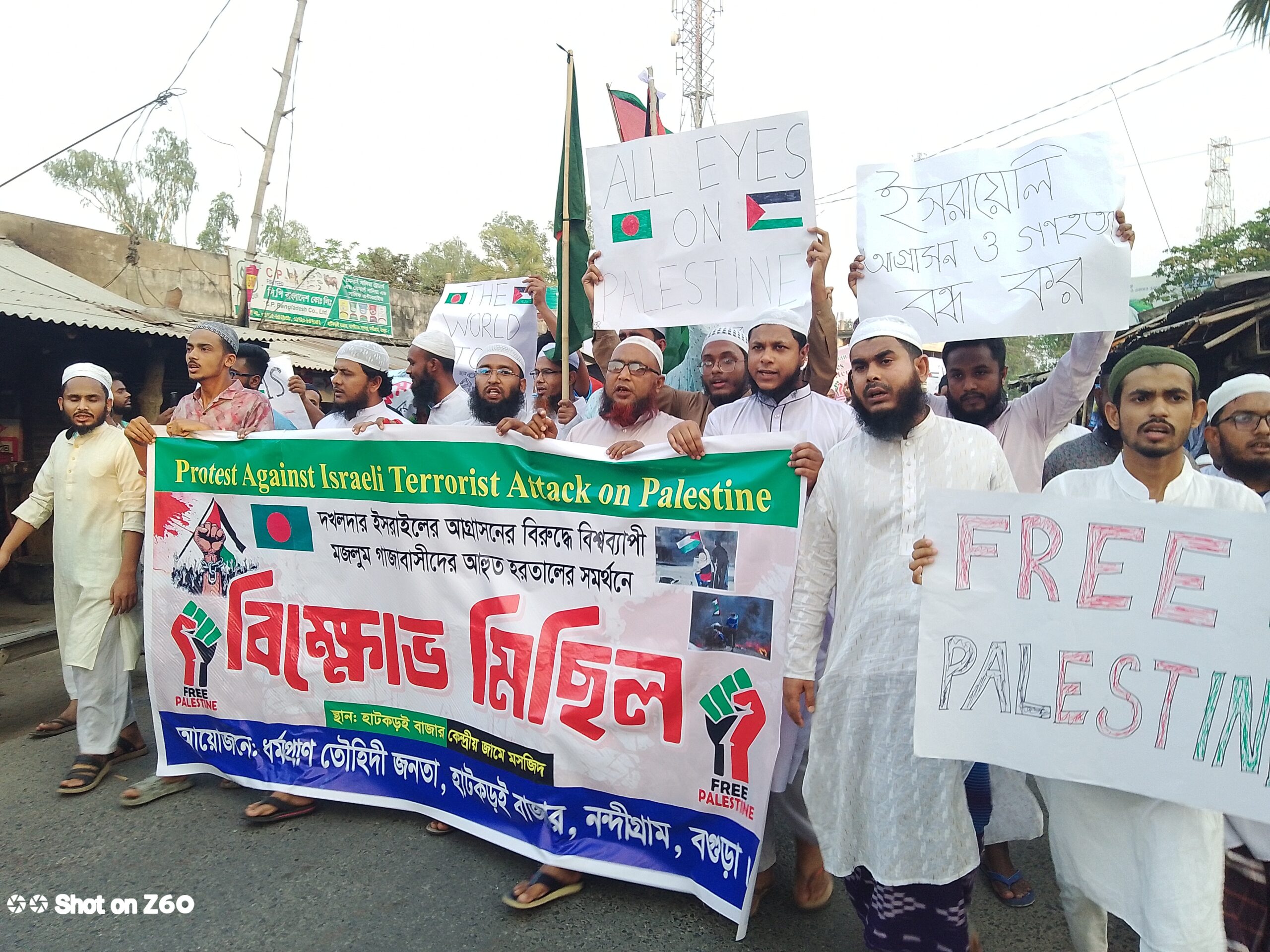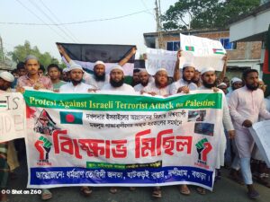 বাদ আছর নন্দীগ্রাম উপজেলার হাট কড়ই বাজারে কেন্দ্রীয় জামে মসজিদ থেকে একটি বিশাল বিক্ষোভ মিছিল বের হয় অংশ নেয় হাজারো জনতা।বক্তারা বলেন, আজ ফিলিস্তিন যেন রক্তাক্ত করুণার প্রতিচ্ছবি। আর ইসরাইল একটি রাষ্ট্রের নাম নয়, বরং তা মানবতার বিরুদ্ধে সংঘটিত এক কুখ্যাত সন্ত্রাসী শক্তির নাম। ইসরাইল অবিলম্বে তার হত্যাযজ্ঞ দখলদারিত্ব ও গণবিধ্বংসী কার্যক্রম বন্ধ করুক নতুবা মুসলিম উম্মাহর ধৈর্যের সীমা চূর্ণবিচূর্ণ হয়ে যাবে। আল্লাহর ঘর মজলুম ভাই-বোনদের রক্ষায় আমরা জীবনপণ লড়াইয়ে প্রস্তুত। সন্ত্রাসী ইসরাইলকে আমরা স্পষ্ট বার্তা দিচ্ছি মুসলমানদের প্রতিটি ফোঁটা রক্তের হিসাব এই দুনিয়াতেই দিতে হবে। বক্তারা আরও বলেন, ইসরাইলি আমেরিকান ও ভারতীয় পণ্য সম্পূর্ণভাবে বর্জন করে তাদের অর্থনীতিকে ভেঙে ফেলতে হবে। ইনশাআল্লাহ ফিলিস্তিন মুক্ত হবেই। দখলদার ইসরাইল ধ্বংস হবে। ইতিহাসের আস্তাকুঁড়ে তার নাম চিরতরে বিলীন হয়ে যাবে। মজলুমের কান্না আল্লাহ শুনছেন। জুলুম বেশিদিন টিকে থাকবে না,সহ বক্তারা তাদের বক্তব্যে কঠোর হুঁশিয়ারি প্রদান করেন।