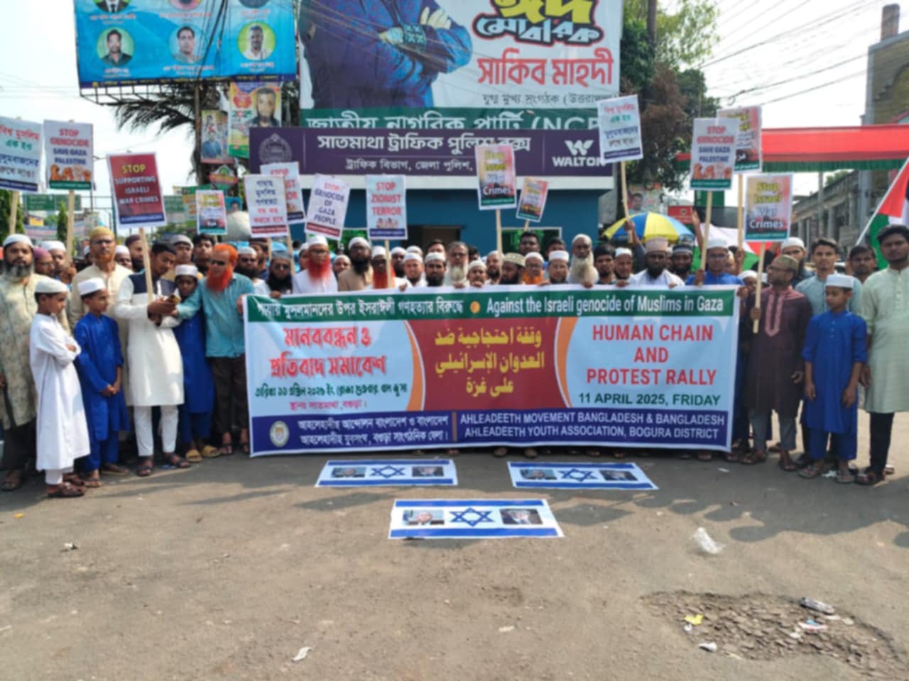 ফিলিস্তিনের গাজা ও রাফা শহরে ইসরায়েলের বর্বর হামলা ও গণহত্যার প্রতিবাদে বগুড়া শহরের সাতমাথায় আহলেহাদীছ আন্দোলন বাংলাদেশ ও বাংলাদেশ আহলেহাদীছ যুবসংঘের মানববন্ধন ও প্রতিবাদ সমাবেশ অনুষ্ঠিত হয়েছে।শুক্রবার (১১ এপ্রিল) বাদ জুম’আ বগুড়া শহরের সাতমাথায় কেন্দ্রীয় নির্দেশ অনুযায়ী এ কর্মসূচি পালন করা হয়। মানববন্ধনটি শহরের সাতমাথা থেকে শুরু হয়ে নবাববাড়ি-থানামোড় প্রদক্ষিন করে সাতমাথায় শেষ হয়। সড়ক প্রদক্ষিণ করে মিছিলে ’ইসরাইল নিপাত যাক’, ’আমার ভাই মরলো কেন, জবাব চাই, জবাব চাই’, ’ইসরাইলি পণ্য, বয়কট, বয়কট’সহ বিভিন্ন স্লোগান দেন।সাতমাথায় আহলেহাদীছ আন্দোলন বাংলাদেশ বগুড়া জেলা সভাপতি হাফেজ মোখলেছুর রহমানের সভাপতিত্বে ও কেন্দ্রীয় শুরা ও কাউন্সিল সদস্য মুহাম্মাদ আল আমীন এর পরিচালনায় বক্তব্য রাখেন, আন্দোলনের জেলা সেক্রেটারি নুরুল ইসলাম, মাওলানা আব্দুল্লাহ বিন আব্দুর রহীমসহ অনেকে।সমাবেশে ফিলিস্তিনে দখলদার ইসরায়েলি বাহিনীর হামলা ও গণহত্যার তীব্র নিন্দা ও প্রতিবাদ জানিয়ে মাওলানা আব্দুল্লাহ বিন আব্দুর রহীম বলেন, সাম্প্রতিক সময়ে ফিলিস্তিনের গাজা ও রাফায় ইসরায়েল যে হামলা ও গণহত্যা চালাচ্ছে, তা পৃথিবীর ইতিহাসে নজিরবিহীন। নির্মম এ গণহত্যা ও মানবিক বিপর্যয়ের ভয়াবহতা দেখেও পশ্চিমা বিশ্বের দেশগুলো উদাসীন ও নির্বিকার।কেন্দ্রীয় শুরা ও কাউন্সিল সদস্য মুহাম্মাদ আল আমীন বলেন, বাংলাদেশসহ মুসলমান প্রধান দেশগুলো সবসময় ফিলিস্তিনিদের জন্য একটি স্বাধীন রাষ্ট্র গঠন এবং ‘নিপীড়িত’ ফিলিস্তিনিদের প্রতি সংহতি জানিয়ে আসলেও বড় ধরণের সংকট এলে পুরো মুসলিম বিশ্বকে ফিলিস্তিনিদের পক্ষে খুব একটা শক্ত অবস্থান নিতে দেখা যায় না কেন? এমনকি মুসলিম দেশগুলোর সংগঠন ওআইসি কিংবা আরব লীগও ইসরায়েলের সাথে সংকটকালে ফিলিস্তিনের পক্ষে খুব জোরালো কোন ভূমিকা নিতে পারে না কেন? এজন্য তিনি ক্ষোভ প্রকাশ করেন সেই সাথে ইসরাইলি সকল পণ্য বর্জন করার দাবি জানান।উক্ত সমাবেশে উপস্থিত ছিলেন আন্দোলনের জেলা সহ-সভাপতি ছহীমুদ্দিন, বেলাল হোসাইন,সাইফুল ইসলাম, নজরুল ইসলাম, শরিফুল ইসলাম, রফিকুল ইসলাম মাষ্টার, ফরিদ উদ্দিন, আবু বক্কর সিদ্দীক, জেলা যুবসংঘের সভাপতি রমজান আলী সহ, জেলা আন্দোলন ও যুবসংঘের নেতৃবৃন্দ।