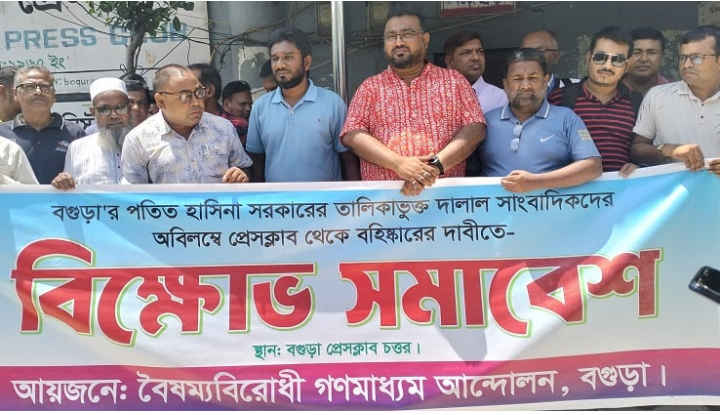শনিবার দুপুর ১২টায় বগুড়া প্রসক্লাব চত্বরে ‘বৈষম্যবিরোধী গণমাধ্যম আন্দোলন’ বগুড়া শাখার আয়োজনে বিক্ষোভ সমাবেশে এ দাবি জানানো হয়।বগুড়া প্রেসক্লাব নির্মাণের নামে সাবেক সভাপতি মাহমুদুল আলম নয়ন এবং সাবেক সাধারণ সম্পাদক আমজাদ হোসেন মিন্টু কোটি কোটি টাকা আত্মসাৎ করেছেন অভিযোগ করে সাংবাদিকরা বলেন, তাদের সহযোগী হিসেবে কাজ করেছেন মুখচেনা আরও কিছু আওয়ামী লীগের ‘প্রকাশ্য দালাল সাংবাদিক’। তারা বিনা ভোটে দীর্ঘদিন জোর করে প্রেসক্লাবের পদ দখল করে ছিলেন।