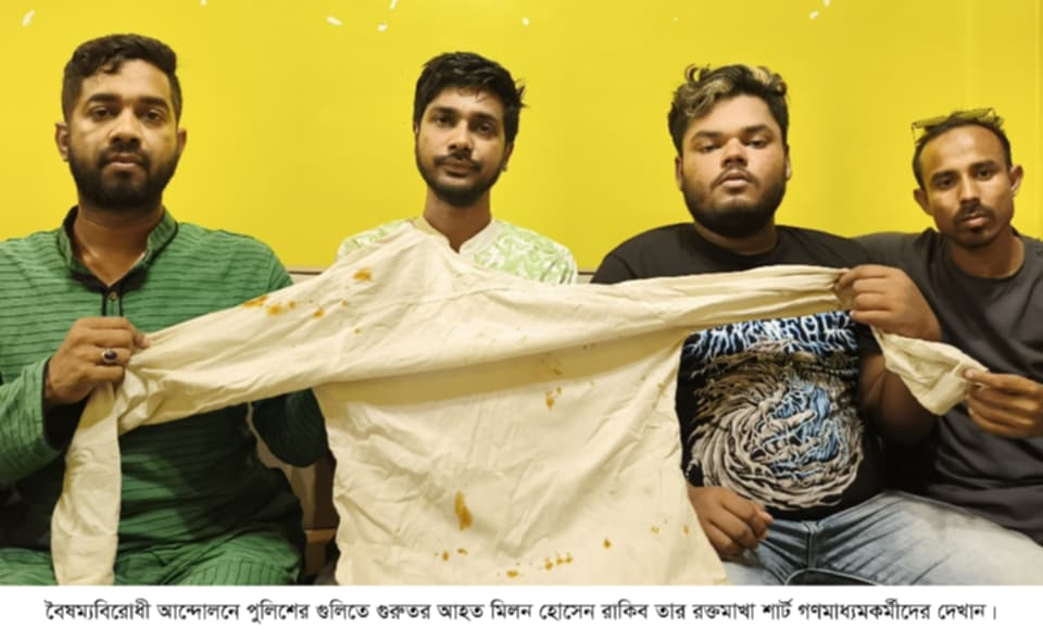 বৈষম্যবিরোধী আন্দোলনে গিয়ে পুলিশের গুলিতে গুরুতর আহত মিলন হোসেন রাকিব পায়নি সরকারি কোনো সহায়তা, এমনকি আহতদের তালিকায় নেই নাম।বৈষম্য বিরোধী আন্দোলনে বগুড়া শহরে ৪রা আগস্ট পুলিশের ছোঁড়া ১৮টি ছররা গুলিতে আহত হন মিলন। এখন পর্যন্ত সরকারি কোনো চিকিৎসা খরচ পায়নি সে। এমনকি সরকারের করা আহতদের তালিকায় নেই তার নাম।মিলন হোসেন রাকিব নাটোরের সিংড়া উপজেলা ছাত্রদলের আহ্বায়ক কমিটির ১নম্বর সদস্য ও পৌর ছাত্রদলের যুগ্ম আহ্বায়ক। তিনি পৌরসভার নিংগইন মহল্লার মৃত কালাম ও মোছা: মরিয়ম বেগম দম্পতির সন্তান।সর্বশেষ গত এপ্রিল মাসের ২২ তারিখে সিংড়া উপজেলা স্বাস্থ্য কমপ্লেক্সে অস্ত্রোপচার করে বের করা হয় তার শরীরে লাগা ১৮তম গুলি।বৈষম্যবিরোধী আন্দোলনে আহত ছাত্রদল নেতা মিলন হোসেন রাকিব বলেন, বৈষম্যবিরোধী আন্দোলন শুরু হলে তিনি ১৮ জুলাই প্রথম দিনে সিংড়ায় আন্দোলনে অংশ নেয়। এরপর ১৯ জুলাইও আন্দোলন করে। পরবর্তীতে ১লা, ২রা, ৩রা ও ৪রা আগস্ট বগুড়া শহরে ছাত্র-জনতার সাথে আন্দোলনে অংশ নেয়। পুলিশের সাথে ছাত্র-জনতার সংঘর্ষের এক পর্যায়ে ৪রা আগস্ট বিকেল ৪টার দিকে তার শরীরে ১৮টি ছররা গুলি ঢুকে।