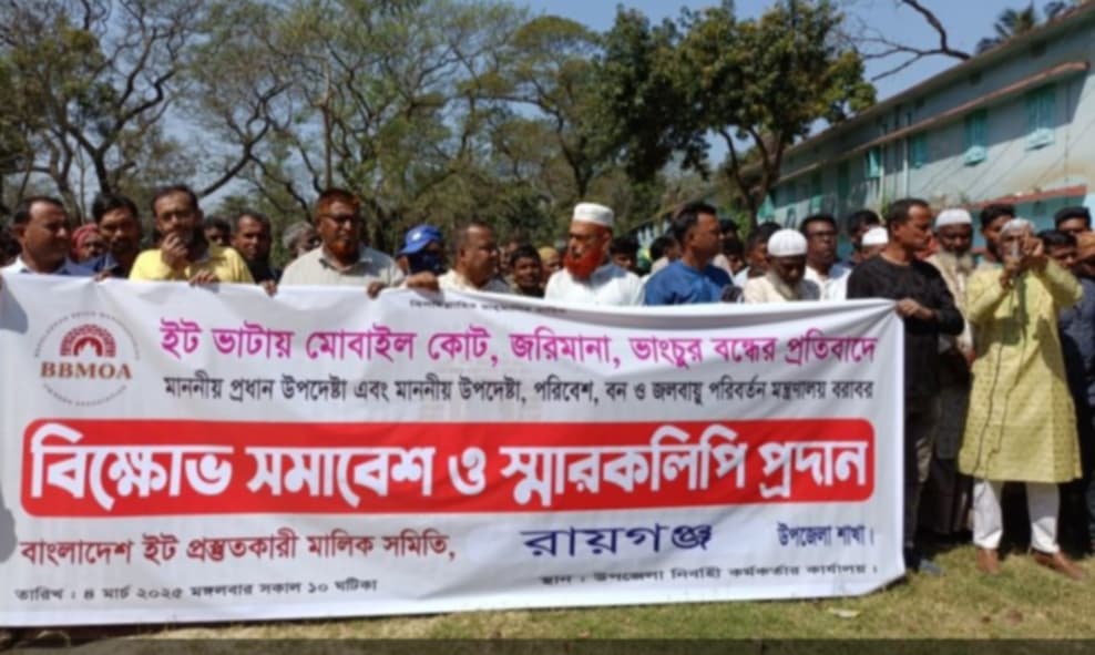 সিরাজগঞ্জের রায়গঞ্জে ইট ভাটায় মোবাইল কোর্ট, জরিমানা, ভাংচুর বন্ধের দাবিতে বিক্ষোভ সমাবেশ ও স্মারকলিপি প্রদান করেছে ইটভাটা মালিক সমিতি।