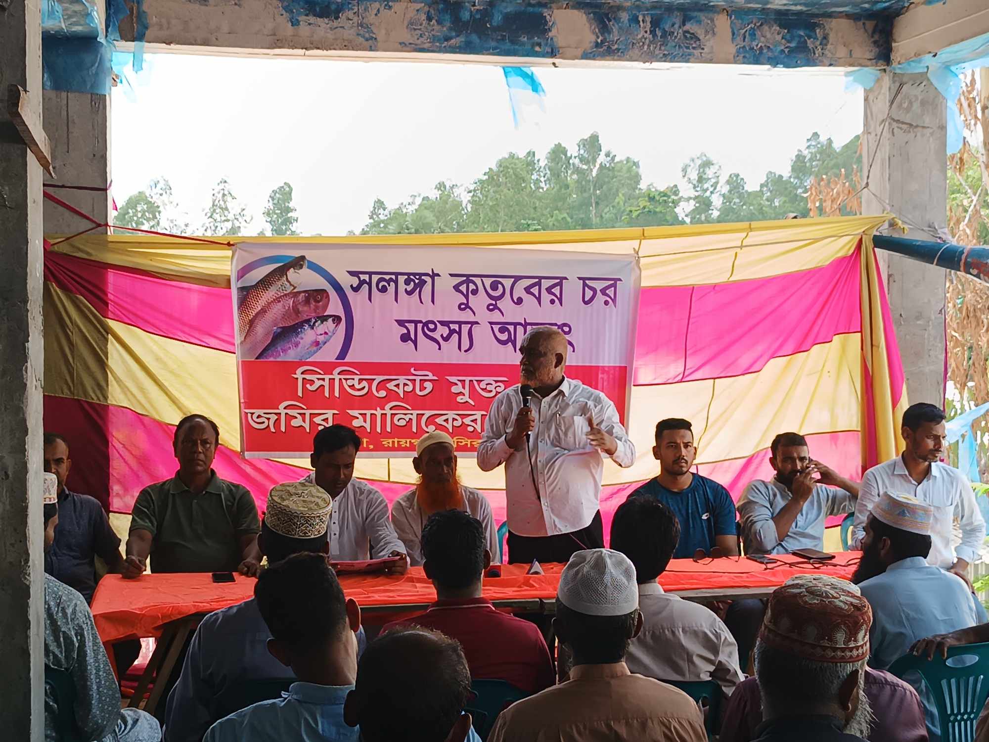 সংবাদ সম্মেলনে বক্তারা বলেন, দীর্ঘ ৯ মাস পূর্বে সলঙ্গা থানার কুতুবের চর গ্রামে ৮ বিঘা জমির উপর এই বৃহৎ মৎস্য আড়ৎটি গড়ে উঠে। একটি কুচক্রী মহল এই মৎস্য আড়ৎকে কেন্দ্র করে গড়ে তোলে এক বিশাল সিন্ডিকেট। আর এই সিন্ডিকেটের নেপথ্যে রয়েছে আব্দুল হাই এবং ধুবিল ইউনিয়ন পরিষদের চেয়ারম্যান মিজানুর রহমান রাসেল।অধিকার বঞ্চিত ২৫ জন ভুমি মালিককে বিভিন্ন ভয়ভীতি প্রদর্শন করে এবং তাদের বিরুদ্ধে মিথ্যা মামলা দায়ের করে অহেতুক হয়রানি করছে ।