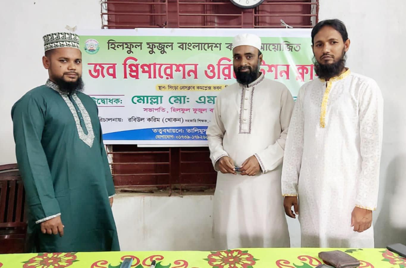 নাটোরের সিংড়ায় হিলফুল ফুজুল বাংলাদেশ এর উদ্যোগে ১৯তম শিক্ষক নিবন্ধনসহ সকল সরকারি চাকুরী প্রত্যাশীদের প্রস্তুতি ক্লাসের উদ্বোধন হয়েছে।সোমবার (৫ মে) বিকেল ৪টায় সিংড়া প্রেস ক্লাব কমপ্লেক্স ভবনে আনুষ্ঠানিকভাবে প্রস্তুতি ক্লাসের উদ্বোধন করেন সিংড়া প্রেস ক্লাব ও হিলফুল ফুজুল বাংলাদেশ এর সভাপতি মোল্লা মোঃ এমরান আলী রানা।উদ্বোধনী ক্লাসে চাকুরী প্রত্যাশীদের উদ্দেশ্যে বক্তব্য দেন পাবনা পুস্পপাড়া কামিল মাদ্রাসার আরবি প্রভাষক মাওলানা ওমর ফারুক ও সিংড়া সবিরন-গুলজান স্কুল এন্ড কলেজের গনিতের সহকারী শিক্ষক রবিউল করিম খোকন।এসময় উপস্থিত ছিলেন মুফতি জাকারিয়া মাসউদ, সিংড়া প্রেস ক্লাবের নির্বাহী সদস্য আবু জাফর সিদ্দিকী, কাবিল উদ্দিন কাফিসহ চাকুরী প্রত্যাশীরা।