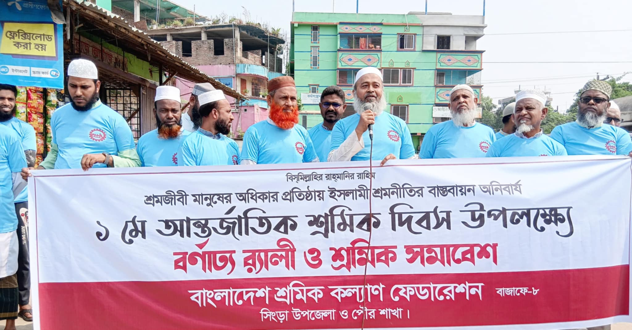 বাংলাদেশ শ্রমিক কল্যাণ ফেডারেশন নাটোরের সিংড়া উপজেলা শাখার আয়োজনে আন্তর্জাতিক মে দিবস পালিত হয়েছে।বৃহস্পতিবার (১লা মে) সকাল ৮টায় একটি র‍্যালি বের হয়ে শহর প্রদক্ষিণ শেষে সিংড়া বাসস্ট্যান্ড এলাকায় সমাবেশ করে।সমাবেশে প্রধান অতিথির বক্তব্য দেন জেলা জামায়াতের কর্মপরিষদ সদস্য ও নাটোর-৩ (সিংড়া) আসনে জামায়াত মনোনীত সংসদ সদস্য পদপ্রার্থী প্রফেসর সাইদুর রহমান।বিশেষ অতিথির বক্তব্য দেন জেলা জামায়াতের কর্মপরিষদ সদস্য আফছার আলী, উপজেলা জামায়াতের আমির অধ্যাপক আ ব ম আমান উল্লাহ্, সেক্রেটারি অধ্যাপক এন্তাজ আলী, পৌর জামায়াতের আমীর প্রভাষক সাদরুল উলা, সহকারী সেক্রেটারি আব্দুল মন্নাফসহ নেতৃবৃন্দ।সভাপতিত্ব করেন উপজেলা শ্রমিক কল্যাণ ফেডারেশনের সভাপতি আবু মুসা ফেরদৌস ও পরিচালনা করেন পৌর শ্রমিক কল্যাণ ফেডারেশনের সভাপতি রফিকুল ইসলাম।