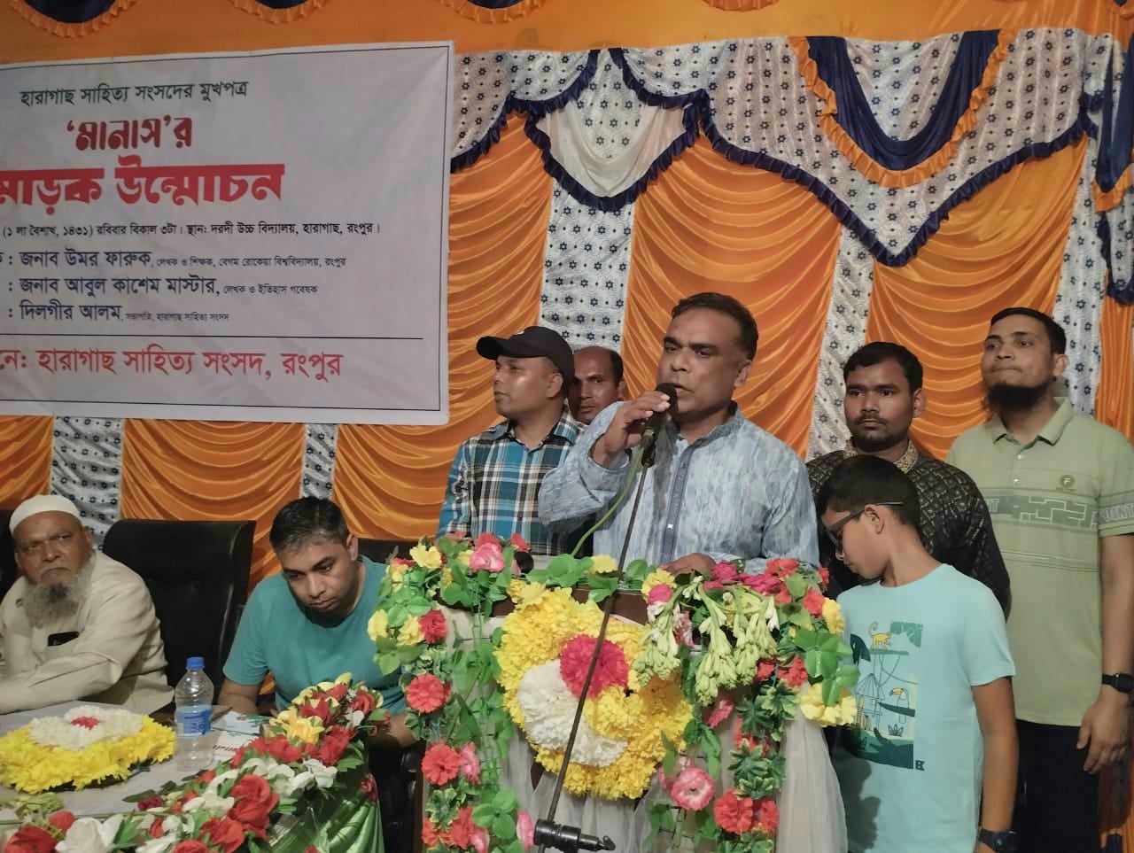 রবিবার ১৪ এপ্রিল ২০২৪ বিকাল ৩ টায় হারাগাছের দরদী উচ্চ বিদ্যালয় হলরুমে হারাগাছ সাহিত্য সংসদের মুখপত্র মানাস ৩য় সংখ্যার মোড়ক উন্মোচন অনুষ্ঠান জাঁকজমকপূর্ণভাবে অনুষ্ঠিত হয়। সভাপতি হিসেবে উপস্থিত ছিলেন হারাগাছ সাহিত্য সংসদের সভাপতি জনাব দিলগীর আলম। সম্মানিত আলোচক হিসেবে প্রাণবন্ত আলোচনা করেন লেখক ও বেগম রোকেয়া বিশ্ববিদ্যালয়ের শিক্ষক জনাব উমর ফারুক, রিস্টার্ট ইওরসেল্পের প্রতিষ্ঠাতা লাইফ কোচ জাভেদ পারভেজ, ইতিহাস গবেষক আবুল কাশেম। বক্তব্য রাখেন হারাগাছ সাহিত্য সংসদের উপদেষ্টা আ্যডভোকেট ওয়াজিহার রহমান, আবু হেনা মোরশেদ আলী হেলাল, শামিউল আলম শিমু,আবু সাদেক সুলতান,কারমাইকেল কলেজের সহকারী অধ্যাপক মোঃ রিপন মিয়া, সহকারী অধ্যাপক শেখ সাদী সাজ্জাদ কায়সার। আমন্ত্রিত অতিথি হিসেবে বক্তব্য রাখেন কবি ও সাংবাদিক নজরুল মৃধা, তৈয়বুর রহমান বাবু, জোসেফ আক্তার, শফিজ উদ্দিন মাষ্টার, সাংবাদিক সংগঠক শাহ আলম, সাংবাদিক ও লেখক রিয়াজুল হক সাগর, আখতারুজ্জামান সবুজ, রাজু ইসলাম, ফরহাদুজ্জামান,মিজানুর রহমান, মেট্রো প্রেসক্লাবের সাধারণ সম্পাদক মাসুদ পারভেজ, হারাগাছ সাহিত্য সংসদ সিনিয়র সহসভাপতি মাসুম মোরশেদ, যুগ্ম সম্পাদক তাপস মাহমুদ প্রমূখ। উপস্থিত ছিলেন হারাগাছ সাহিত্য সংসদের উপদেষ্টা মোতাহার হোসেন ডালু, ইসমত আরা বন্যা, মোকাদ্দেস রাব্বী, শিক্ষক নেতা নাজমুল হক বাদল, শিক্ষক ফারুক হোসেন, সাংবাদিক মোক্তার, আসাদুজ্জামান আসাদ, আমিনুল ইসলাম সুমন, এম আই শাওনসহ বিপুলসংখ্যক সাহিত্য অনুরাগী ব্যক্তিবর্গ। অনুষ্ঠানটি প্রাণবন্ত উপস্থাপনা করেন সম্পাদক ময়নুল ইসলাম।