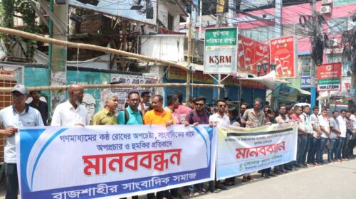 স্বাধীন গণমাধ্যমে হুমকি ও কণ্ঠ রোধের অপচেষ্টা,প্রতিবাদে রাজশাহীতে মানববন্ধন