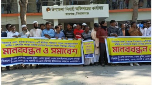রায়গঞ্জে প্যানেল চেয়ারম্যানদের দায়িত্ব না দিয়ে প্রশাসক নিয়োগ দেয়ার প্রতিবাদে মানববন্ধন
